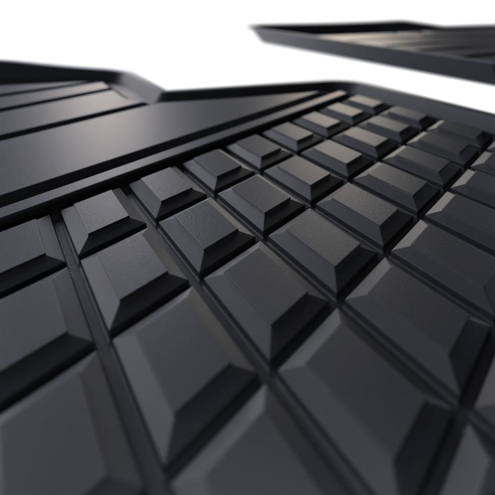 - De matten hebben een modern patroon met een matte afwerking. Elke set wordt op maat gemaakt voor een bepaald automodel en een bepaalde generatie van auto, wat 100% aanpassing aan de voertuigvloer garandeert. De set bevat ook stoppers, als deze in een bepaald automodel aanwezig zijn.
