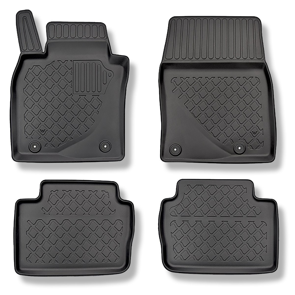 - De matten hebben een modern patroon met een matte afwerking. Elke set wordt op maat gemaakt voor een bepaald automodel en een bepaalde generatie van auto, wat 100% aanpassing aan de voertuigvloer garandeert. De set bevat ook stoppers, als deze in een bepaald automodel aanwezig zijn.