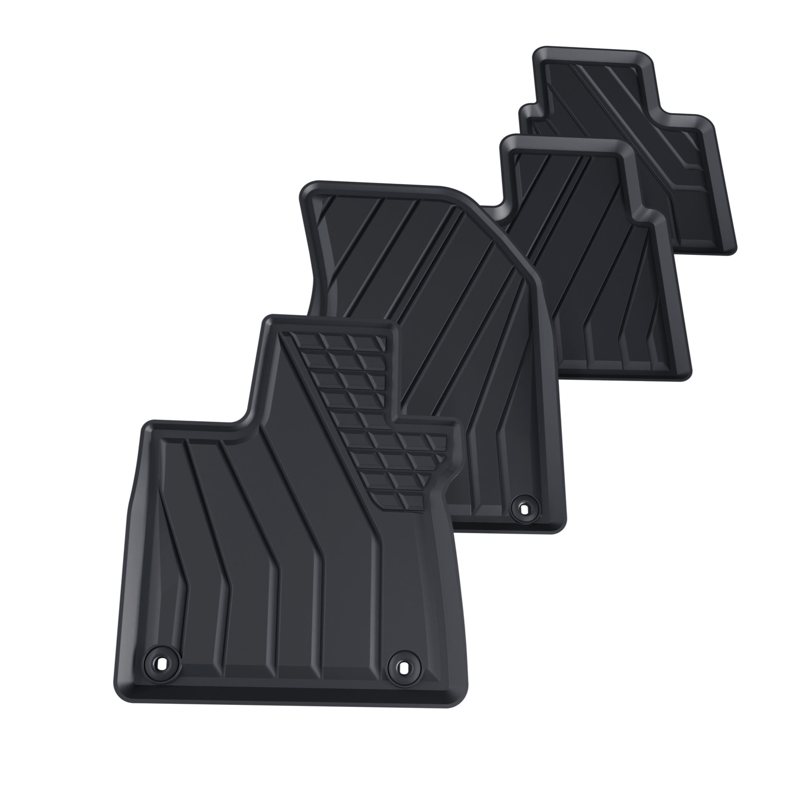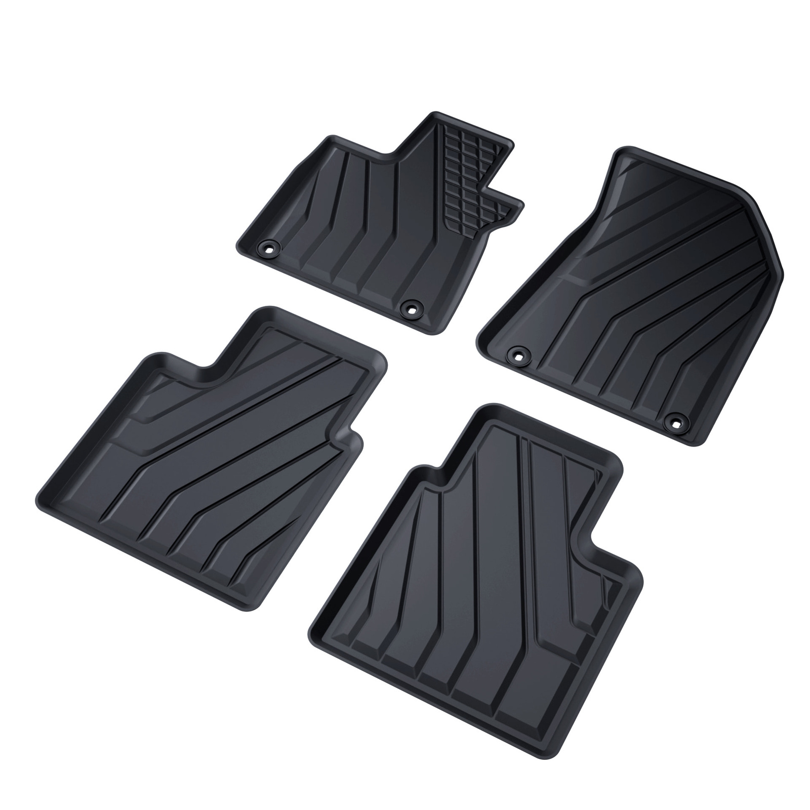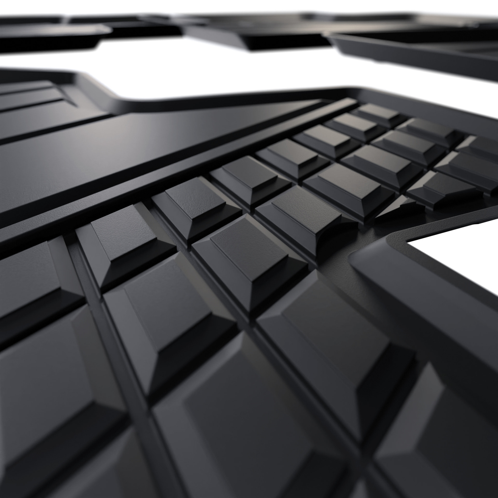 - De matten hebben een modern patroon met een matte afwerking. Elke set wordt op maat gemaakt voor een bepaald automodel en een bepaalde generatie van auto, wat 100% aanpassing aan de voertuigvloer garandeert. De set bevat ook stoppers, als deze in een bepaald automodel aanwezig zijn.