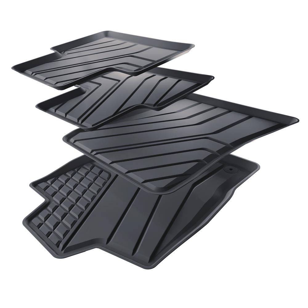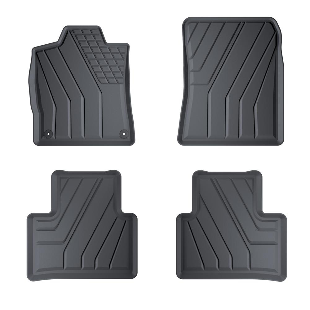 - De matten hebben een modern patroon met een matte afwerking. Elke set wordt op maat gemaakt voor een bepaald automodel en een bepaalde generatie van auto, wat 100% aanpassing aan de voertuigvloer garandeert. De set bevat ook stoppers, als deze in een bepaald automodel aanwezig zijn.